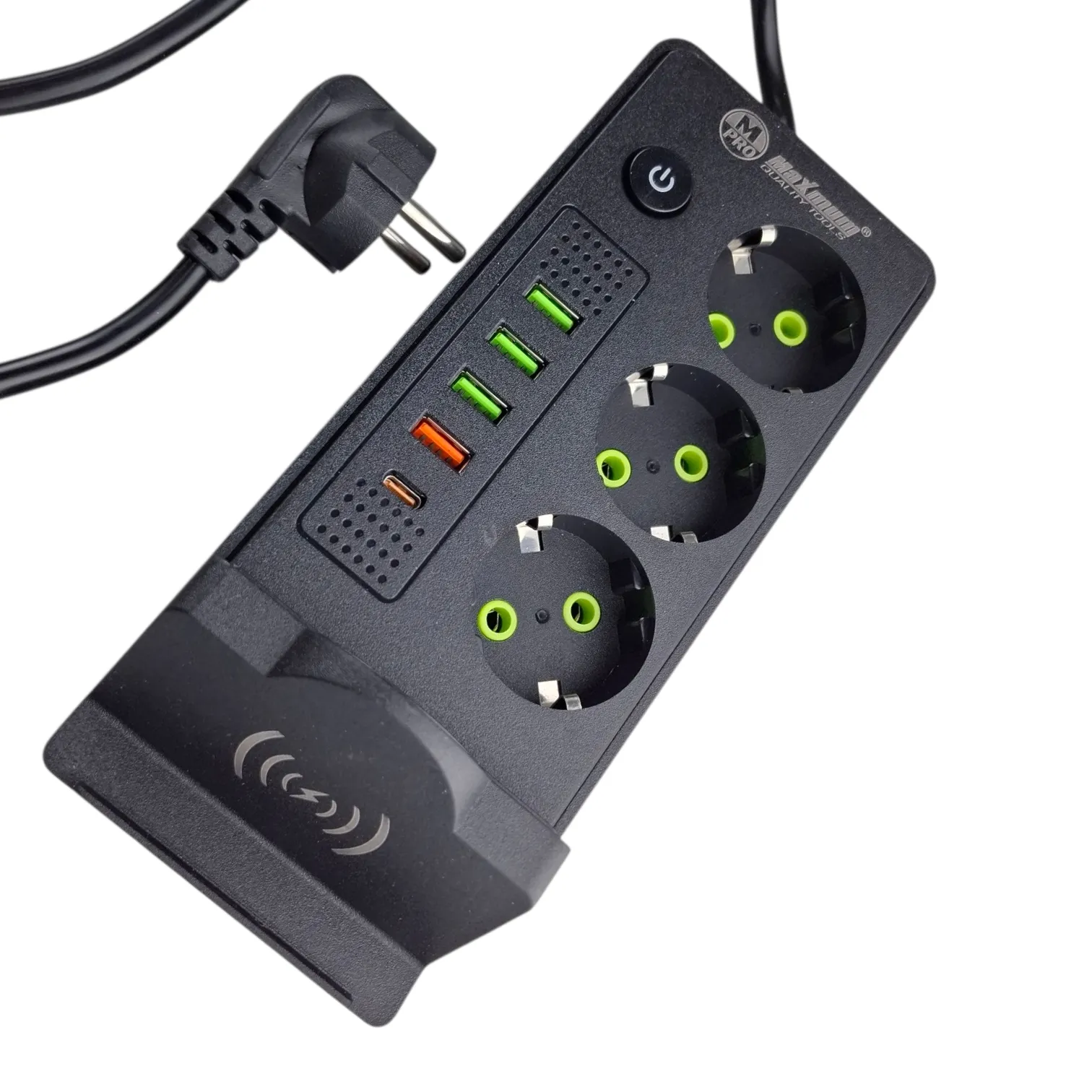 Сетевой фильтр с беспроводной зарядкой на 3 метра от "Maximum Quality Tools" оборудован тремя розетками евро типа с заземлением, а также 4 USB портами и входом Type C. Устройство имеет входное напряжение 220 В и номинальный ток 16 А, что обеспечивает безопасную работу всех подключенных устройств.