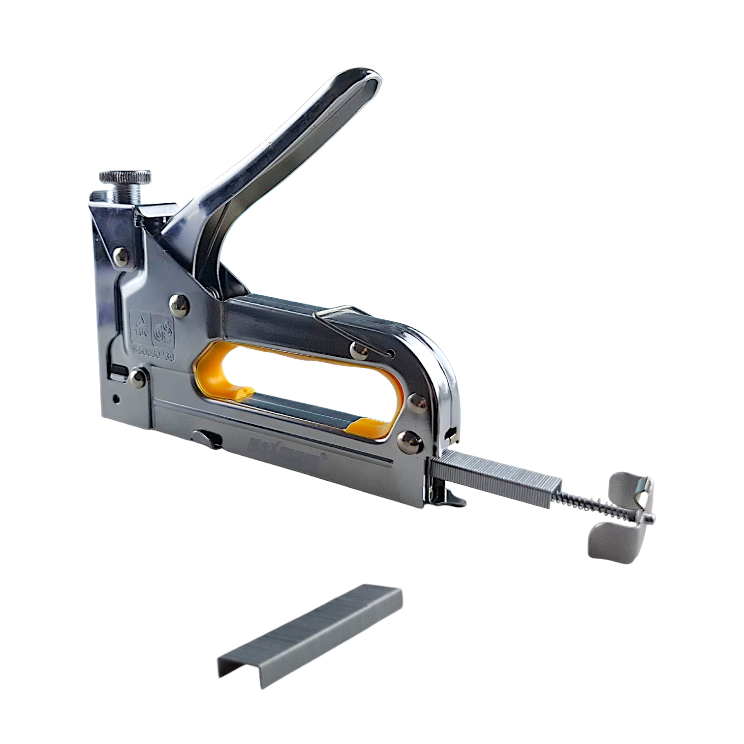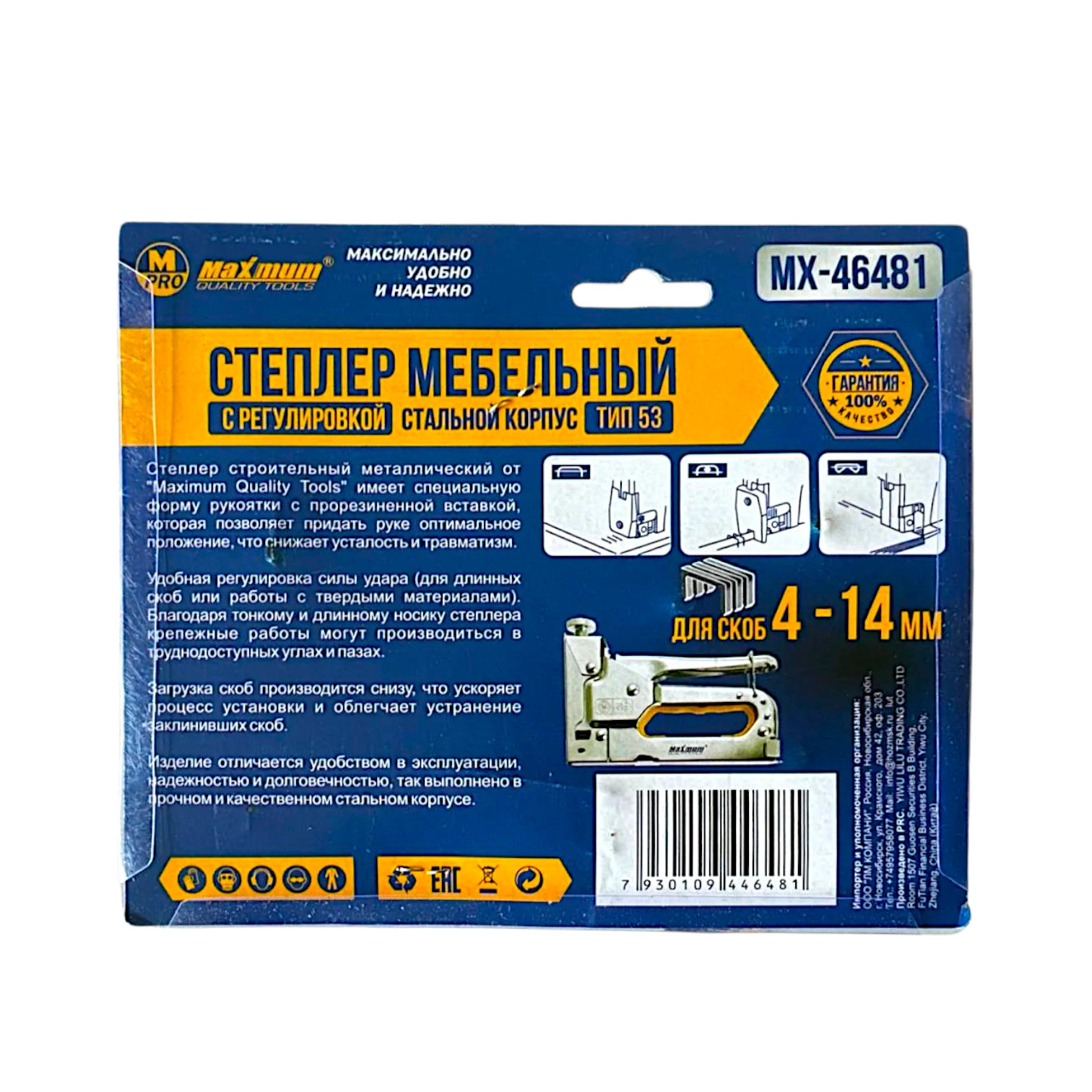 Скобозабивной пистолет механический в комплекте со скобами 200 шт. (8 мм) от бренда «MAXIMUM QUALITY TOOLS» (Максимально Качественный Инструмент) — это надежный инструмент для интенсивного использования. Модель идеально подходит для обивки мебели, монтажа кабеля, а также крепления утеплителя и пленки к различным основаниям. Ударный мебельный степлер (тип 53) работает со скобами 4–14 мм, оснащен верхним регулятором силы удара и фиксатором рукоятки, предотвращающим случайное раскрытие. Прочный стальной корпус с прорезиненной ручкой обеспечивает удобство при длительной работе. Наличие регулировки натяжения пружины позволяет точно дозировать усилие, исключая повреждение материалов при обшивке.