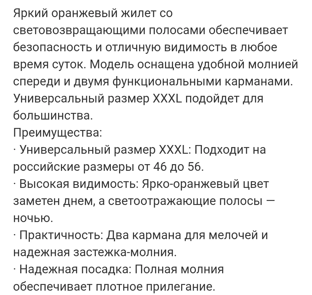 Яркий оранжевый жилет со световозвращающими полосами обеспечивает безопасность и отличную видимость в любое время суток. Модель оснащена удобной молнией спереди и двумя функциональными карманами. Универсальный размер XXXL подойдет для большинства.